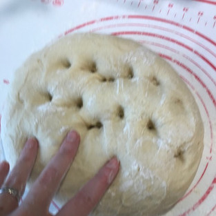 Farinez votre plan de travail, déposez la pâte levée dessus et dégazez-là. Pour cela, appuyez avec vos doigts dedans puis ensuite aplatissez la pâte avec la paume de votre main. Vous devez sentir des bulles d'air s'échapper :