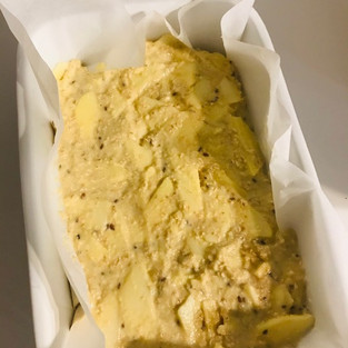 Ajoutez vos lamelles de pommes à cette pâte, mélangez puis coulez le tout dans un moule préalablement garni de papier sulfurisé (ici moule rectangulaire) :