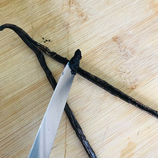 Dans une casserole, mettre à chauffer à feu doux 250g de lait entier + l'intérieur gratté d'une gousse de vanille :