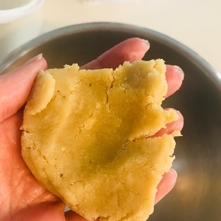 Ajoutez ensuite la cuillère à café d'huile de coco non fondue et malaxer énergiquement le tout à la main jusqu'à obtenir une boule de pâte non collante qui ressemble à une pâte sablée. L'huile de coco se trouve dans tous les magasins bio, elle est très intéressante pour pâtisser healthy ou cuire à la poêle, ou même en cosmétique.