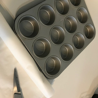 Prenez votre moule en alu et disposez sur chaque emplacement un tout petit morceau de beurre. Découpez du papier sulfurisé en forme carrée (10cmx10cm). Insérez cette découpe dans l'emplacement en appuyant bien pour les coller au beurre.