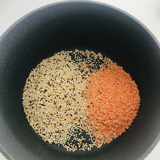 Sel, poivreVersez dans une casserole 60g de quinoa cru et 60g de lentilles corail crues. Remplir toute la casserole d'eau et cuire 12 minutes à partir de la première ébullition.