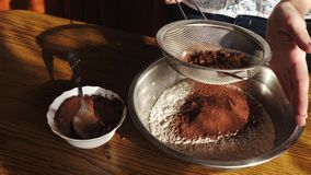 Dans un autre récipient, tamisez la farine (266g) puis la levure (12g) puis la poudre de cacao (67g). Mélanger le tout avec une cuillère pour uniformiser le mélange en une couleur unie.