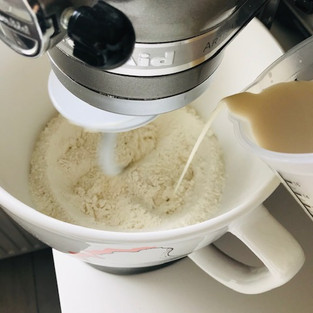 Dans ce mélange farineux, tout en pétrissant avec le crochet, versez petit à petit le liquide préalablement obtenu avec la levure :